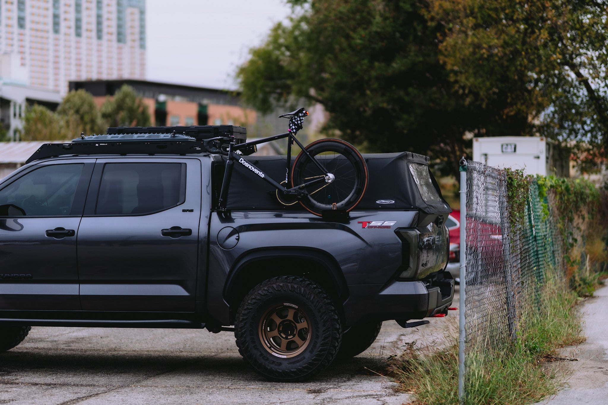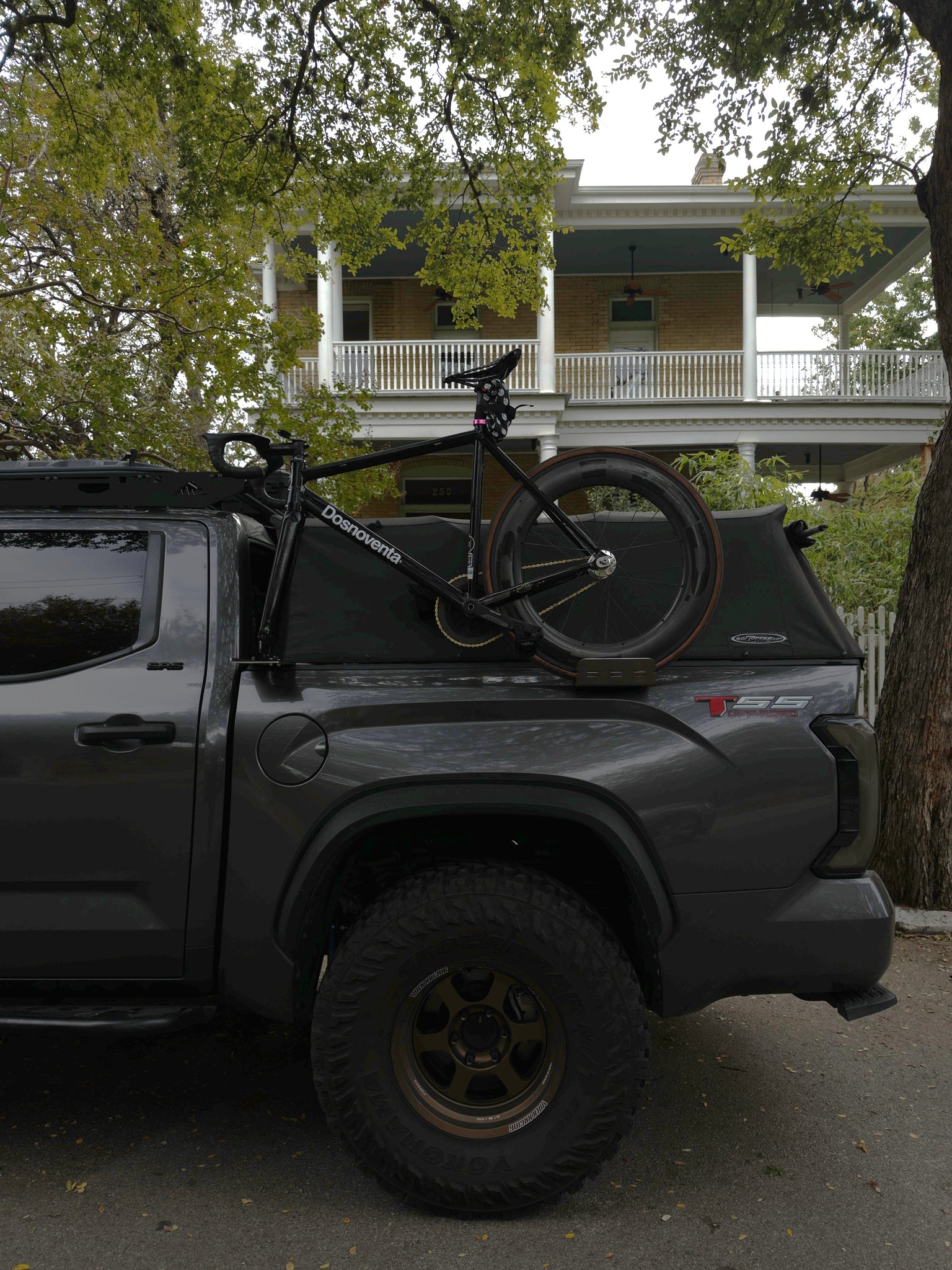 Own a Toyota Tundra with Factory Bed Rails? Have bicycles to transport? The SideRide Bike Mounts enable you to carry a bike without sacrificing ease of mounting your bike, access to the bed, or cargo space. The SideRide Bike Mounts were designed in CAD, and made in the USA!